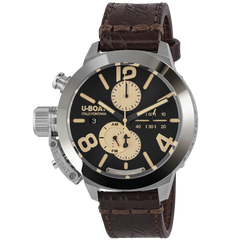 Sellita SW 500 mechanical automatic chronograph with technical modifications to U-BOAT specifications. Frequency 28 800 vibrations/hour 4 Hz. Power reserve 62 hours. 25 jewels. Skeletonized rotor.