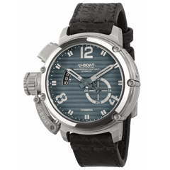 Dial Details: Two Overlapping Levels. Upper Part In Blue Painted Striped Metal Dial. Numbers, Indexes And Indicator With Laser Cutting. Lower Part In Brushed Metal. Hour And Minute Hands In Brushed And Painted Metal With Laser-Cutting. Seconds Hand And 24H Indicator In Brushed And Painted Metal.Strap Details: Laser-Cut Aged Leather With Natural Process, Black Color. Handmade In Tuscany By Expert Craftsmen, With Careful Selection Of Leathers And Materials And Entirely Italian Processing. Waxed Cotton Stitching. Width: 22/22 Mm. Strap: Ref. 9185/Z. Steel Tongue Buckle. Buckle: Ref. 9976.Movement Details: Swiss Automatic Mechanical Eta 2824 Top Soigné, Elaborated And Modified According To U-Boat Specifications. Frequency 28,800 Alternations/Hour (4 Hz). Power Reserve 38 Hours. 25 Jewels. U-Boat Rotor In Brass And Tungsten, Perlage Processing And Rhodium-Plated. Screwed Bridges.Functions: Hours, Minutes, Seconds, Date, 24H Indicator. Patented Crown Release Lever, Positioned At 10 O'Clock (Crown Release System).