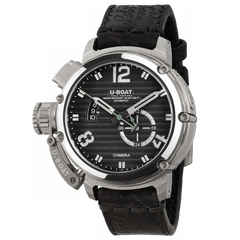 Dial Details: Two Overlapping Levels. Upper Part In Black Painted Striped Metal Dial. Numbers, Indexes And Indicator With Laser Cutting. Lower Part In Brushed Metal. Hour And Minute Hands In Brushed And Painted Metal With Laser-Cutting. Seconds Hand And 24H Indicator In Brushed And Painted Metal.Strap Details: Laser-Cut Aged Leather With Natural Process, Black Color. Handmade In Tuscany By Expert Craftsmen, With Careful Selection Of Leathers And Materials And Entirely Italian Processing. Waxed Cotton Stitching. Width: 22/22 Mm. Strap: Ref. 9185/Z. Steel Tongue Buckle. Buckle: Ref. 9976.Movement Details: Swiss Automatic Mechanical Eta 2824 Top Soigné, Elaborated And Modified According To U-Boat Specifications. Frequency 28,800 Alternations/Hour (4Hz). Power Reserve 38 Hours. 25 Jewels. U-Boat Rotor In Brass And Tungsten, Perlage Processing And Rhodium-Plated. Screwed Bridges.Functions: Hours, Minutes, Seconds, Date, 24H Indicator. Patented Crown Release Lever, Positioned At 10 O'Clock (Crown Release System).